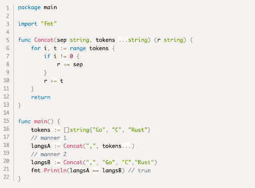 Из приведенных выше двух объявлений функций с переменным числом аргументов мы можем обнаружить, что если параметр с переменным числом аргументов объявлен с частью типа как ...T, то фактически ...T тип параметра равен []T.