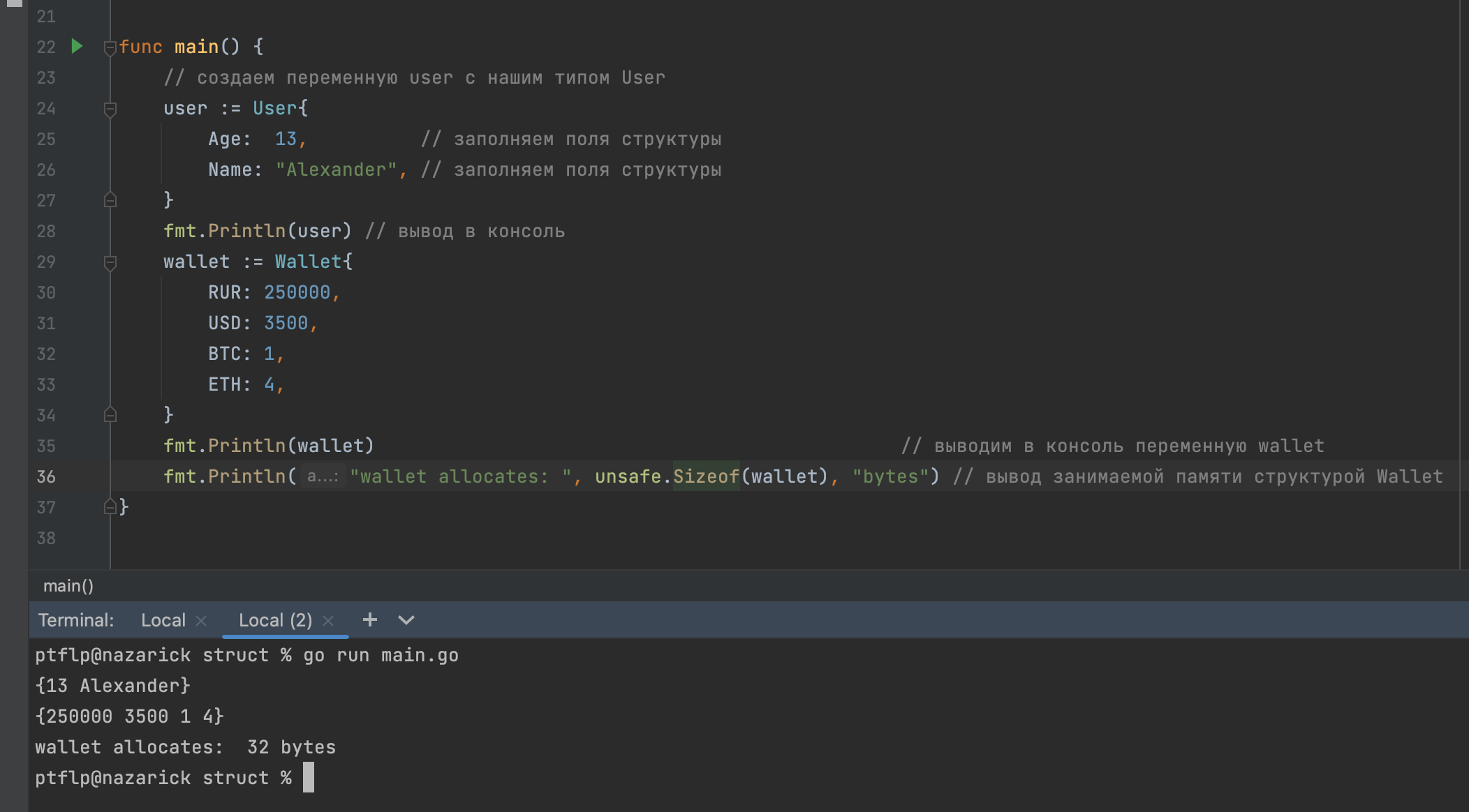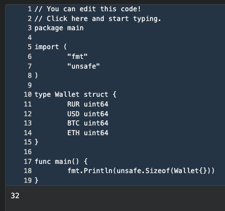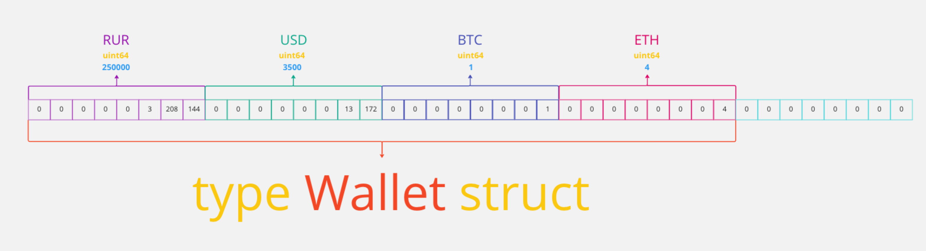 Как видим, наша структура Wallet занимает 32 байта. Давай посчитаем: в структуре четыре поля float64,