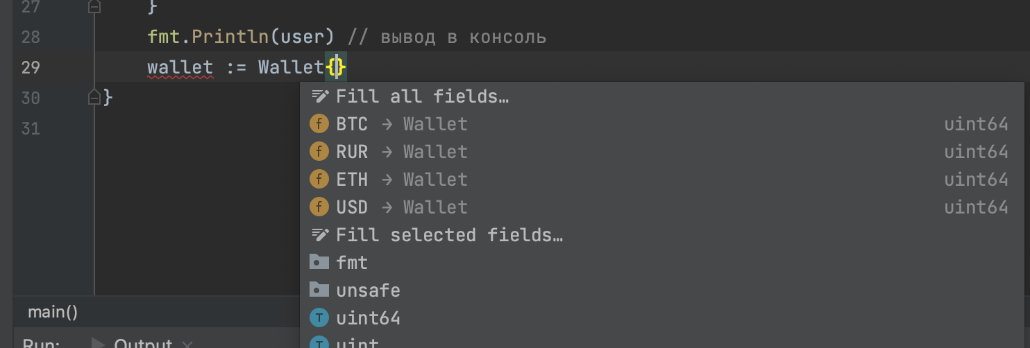 Для быстрой работы пользуемся автодополнением кода, пишем Wallet, далее Fill all fields.