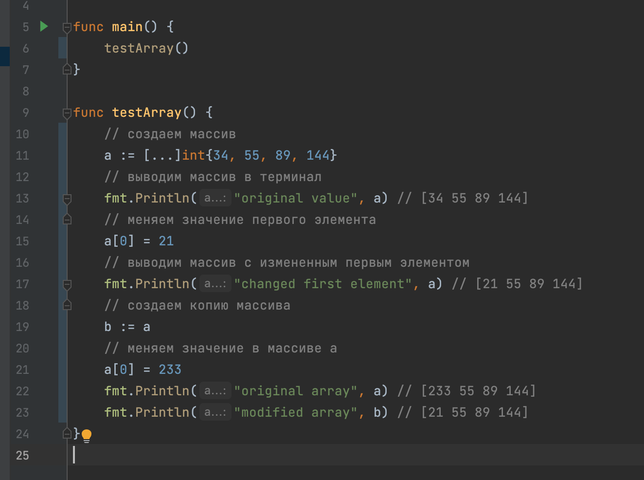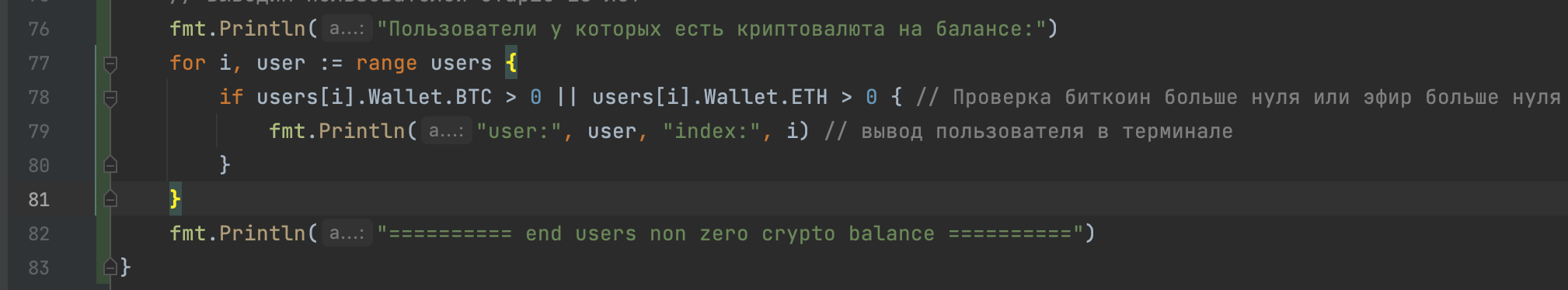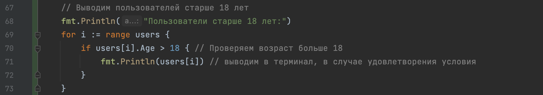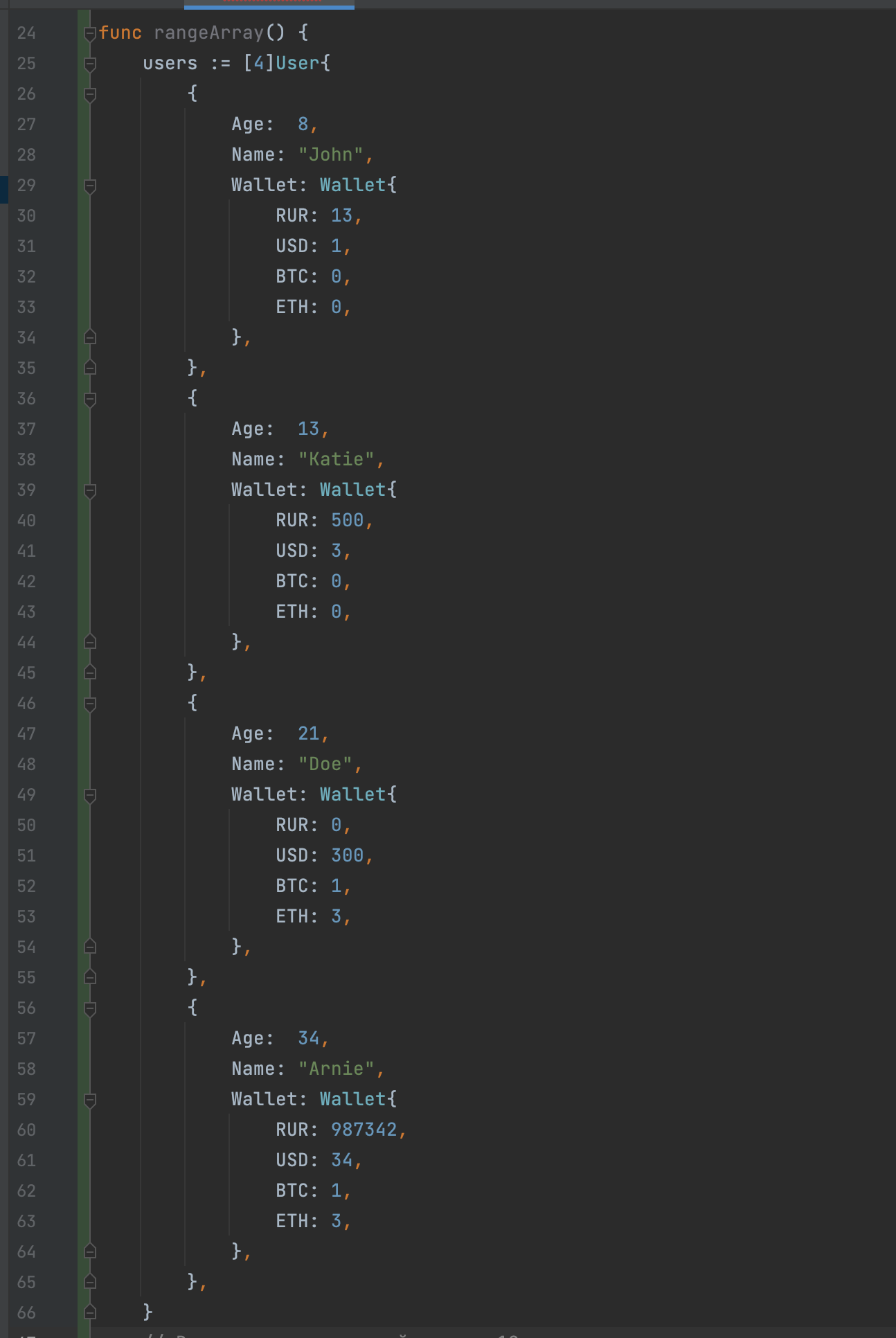 Итерация по массиву (range) — базовая операция, она часто используется с массивами в ситуациях, когда количество элементов уже известно. Например, при отображении определенного количества пользователей мы создадим массив и отфильтруем пользователей по возрасту и по балансу. Продолжаем работу в нашем main.go.