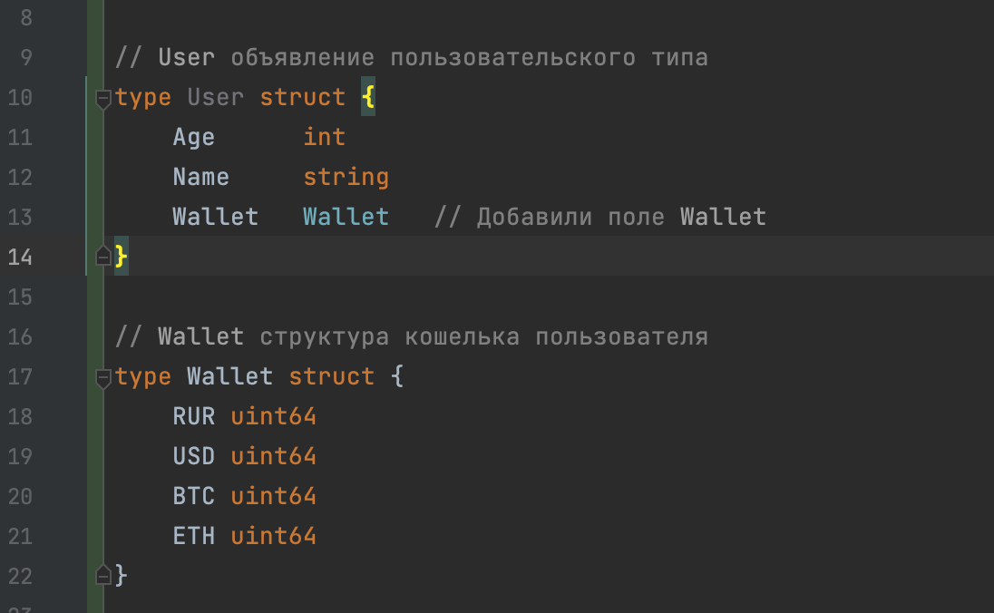 - Скопируй структуру пользователя и кошелька из ранее написанного кода.