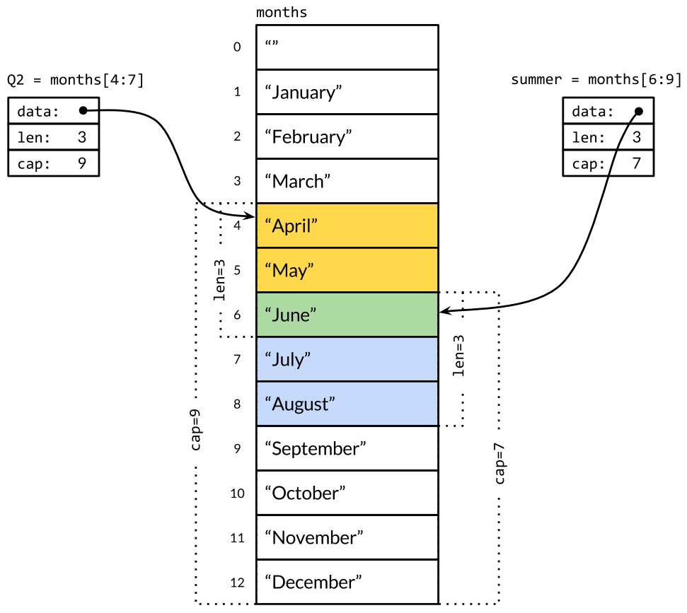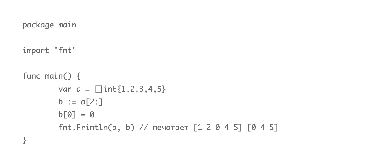 Благодаря второму свойству два среза могут совместно использовать один и тот же базовый массив. Рассмотрим эти примеры.