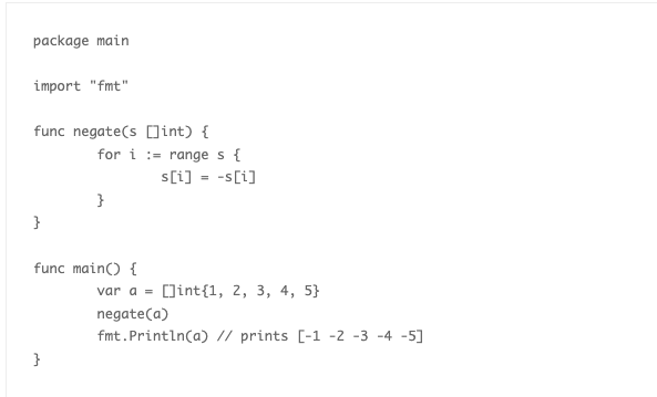 В этом примере a передается аргументом в функцию negate. Функция negate перебирает элементы слайса s, инвертируя их знак. Несмотря на то что negate не возвращает значение или не имеет никакого доступа к объявлению a в main, содержимое a изменяется при передаче в функцию negate.