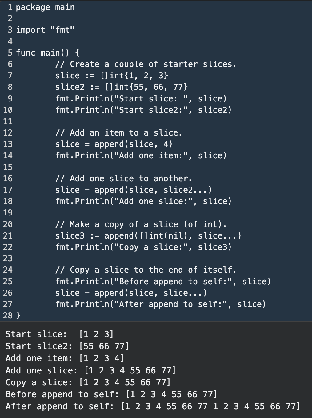 Встроенная функция Append осуществляет те же операции, что и наша функция Append для добавления интовых значений, но работает со всеми типами слайсов.