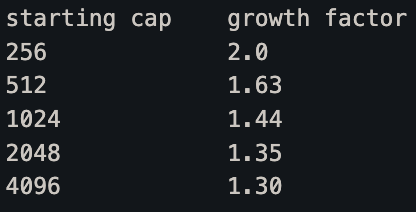 В операции append при превышении емкости (capacity) слайса эта емкость увеличивается в два раза до 256 элементов (до версии go 1.18 в два раза увеличивалась до 1024 элементов), после увеличивается по growth фактору, но на практике эти коэффициенты не выводятся, значения являются примерными.