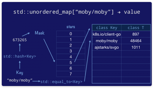 Сначала берем ключ, передаем его функции std::hash для получения хеш-значения ключа. Мы маскируем и индексируем массив корзины (buckets — можно называть бакетс), затем просматриваем записи в этом бакете, сравнивая ключи с помощью функции std::equal_to.