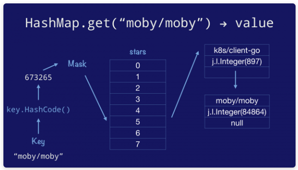 Сначала мы берем ключ и вызываем его метод hashCode для получения хеш-значения ключа. Мы маскируем и индексируем массив бакета. Этот бакет в Java является указателем на Entry, который содержит ключ и значение, а также указателем на следующее Entry в бакете, формирующим связанный список записей.