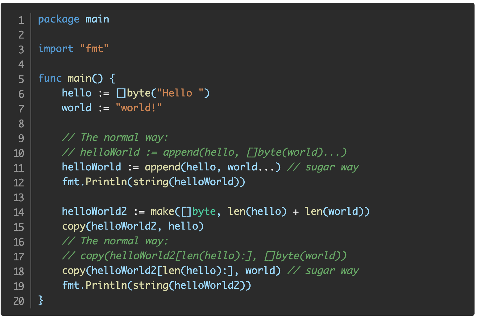 Мы можем использовать встроенные функции copy и append для копирования и добавления элементов среза. На самом деле, как частный случай, если первый аргумент вызова любой из двух функций является байтовым срезом, то второй аргумент может быть строкой. Если вызов является вызовом append, то за строковым аргументом должны следовать три точки .... Строка может использоваться как байтовый срез для особого случая.