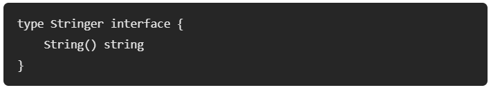 Самое интересное в интерфейсе в Go — это просто набор сигнатур методов. Или мы можем думать об этом как о наборе поведения, которое мы ожидаем от зависимости. Некоторые люди могут назвать это связью contract между двумя или более компонентами. Давайте посмотрим на fmt.Stringer интерфейс.