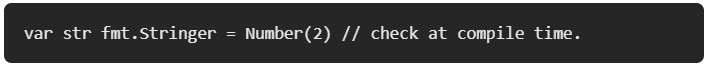 Отсутствие необходимости явного объявления во время компиляции делает интерфейс Go действительно мощным по сравнению с другими языками программирования, такими как Java. Java, как и php, требует явного ключевого слова implements в объявлении класса во время компиляции. Это означает, что тебе нужно импортировать библиотеку, которая определяет интерфейс и все его зависимости только для того, чтобы реализовать его.