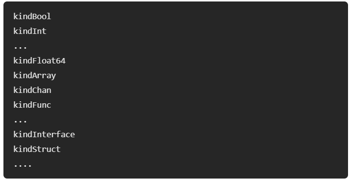 Во время выполнения все поддерживаемые типы определены в runtime/type.go и runtime/typekind.go. Эти типы охватывают все основные типы, а также типы структур и интерфейсов.