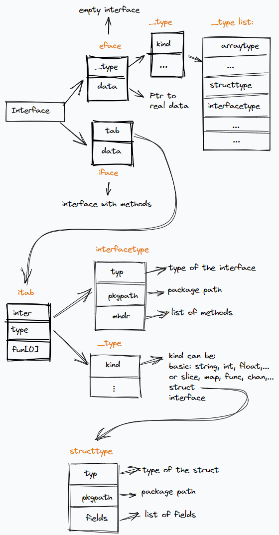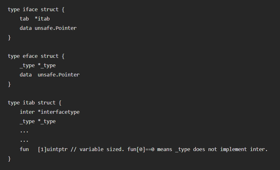 Во время выполнения значения интерфейса будут храниться в структуре eface при пустом интерфейсе или в iface, если у него есть методы. Структура содержит поле _type — информацию о типе значения, которое содержит интерфейс, и поле data, являющееся указателем на реальные данные. В случае iface, itab содержит информацию как об интерфейсе, так и о его целевом типе, а fun[0] указывает, реализует ли тип интерфейс или нет. fun[0] !\= 0 означает, что тип реализует интерфейс.