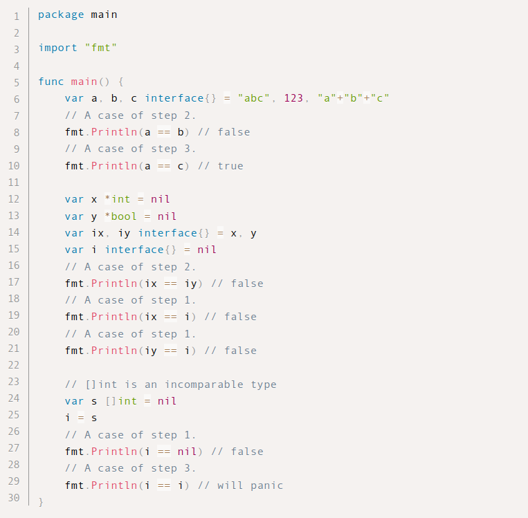 В первом случае тип неинтерфейсного значения должен реализовывать тип (предположим, что это I) интерфейсного значения, поэтому неинтерфейсное значение может быть преобразовано (упаковано) в интерфейсное значение I. Это означает, что сравнение между значением, не относящимся к интерфейсу, и значением интерфейса может быть преобразовано в сравнение между двумя значениями интерфейса. Поэтому ниже будут объяснены только сравнения между двумя значениями интерфейса.