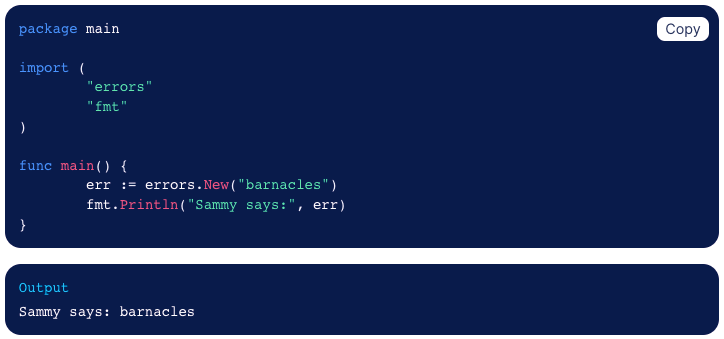 Мы использовали функцию errors.New из стандартной библиотеки для создания нового сообщения об ошибке со строкой barnacles в качестве сообщения об ошибке. Мы выполняли требование конвенции, используя строчные буквы для сообщения об ошибке, как показано в руководстве по стилю для языка программирования Go.