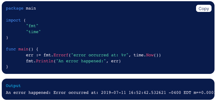 Мы использовали функцию fmt.Errorf для создания сообщения об ошибке, которое будет включать текущее время. Форматированная строка, которую мы предоставили fmt.Errorf, содержит директиву форматирования %v, эта директива указывает fmt.Errorf использовать формат по умолчанию для первого аргумента, предоставленного после форматированной строки. Этот аргумент будет текущим временем, предоставленным функцией time.Now из стандартной библиотеки. Как и в предыдущем примере, мы добавляем в сообщение об ошибке короткий префикс и выводим результат стандартным образом, используя fmt.Println.