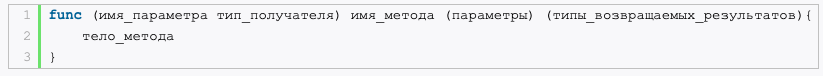 Метод представляет функцию, связанную с определенным типом. Методы определяются так же, как и обычные функции за тем исключением, что в определении метода также необходимо указать получателя или receiver. Получатель — это параметр того типа, к которому прикрепляется метод.