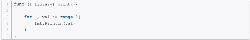 Та часть, которая расположена между ключевым словом func и именем метода представляет определение получателя, для которого будет определен этот метод: (l library). Используя параметр получателя (в данном случае l), мы можем обращаться к получателю. Например, в нашем случае получатель представляет срез — набор объектов. С помощью цикла for можно пройтись по этому срезу и вывести все его элементы на консоль.