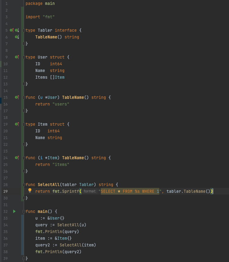В этом примере два объекта — user и item, их абстрактным, а также полиморфным типом является tabler.