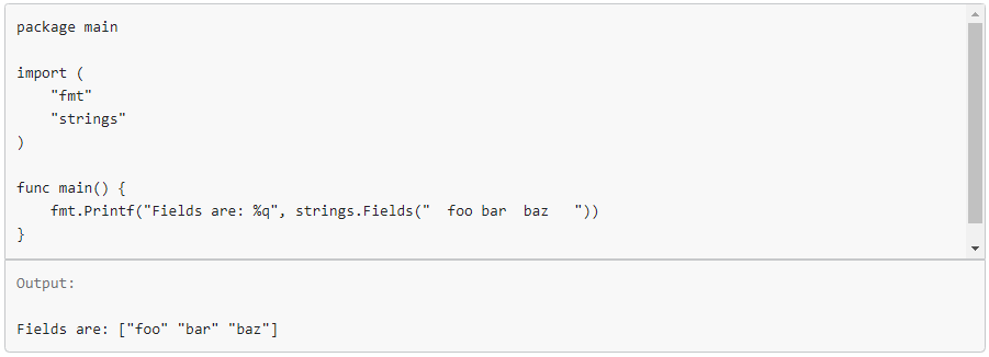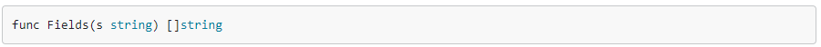 Fields разбивает строку s вокруг каждого экземпляра одного или нескольких последовательных пробельных символов, как определено в unicode.IsSpace, возвращая фрагмент подстрок s или пустой фрагмент, если s содержит только пробелы.