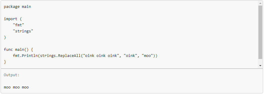 Функция strings.ReplaceAll получает оригинальную строку и возвращает обновленную строку с определенными изменениями.