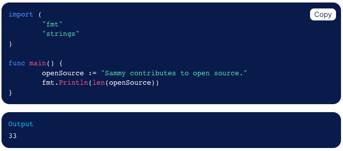 Мы задали переменную OpenSource, которая соответствует строке "Sammy contributes to open source.", а затем передали эту переменную в функцию len() с помощью конструкции len(openSource). В конечном итоге мы передали вывод нашей функции в функцию fmt.Println(), чтобы увидеть результат выполнения программы на экране.