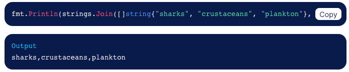 Если мы хотим добавлять запятую и пробел между значениями строк в нашей новой строке, мы можем просто перезаписать наше выражение с пробелом после запятой: strings.Join([]string{"sharks", "crustaceans", "plankton"}, ", ").