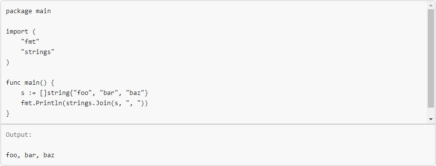 Функция strings.Join полезна для объединения набора строк в новую единую строку.