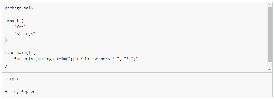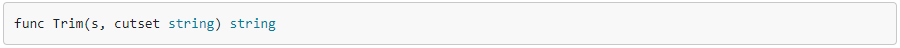 Trim возвращает фрагмент строки s со всеми удаленными начальными и конечными кодовыми точками Unicode, содержащимися в cutset.