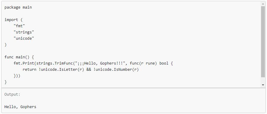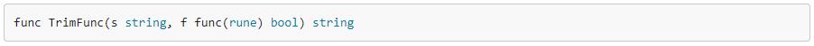 TrimFunc возвращает фрагмент строки s со всеми удаленными начальными и конечными кодовыми точками Unicode c, удовлетворяющими f(c).