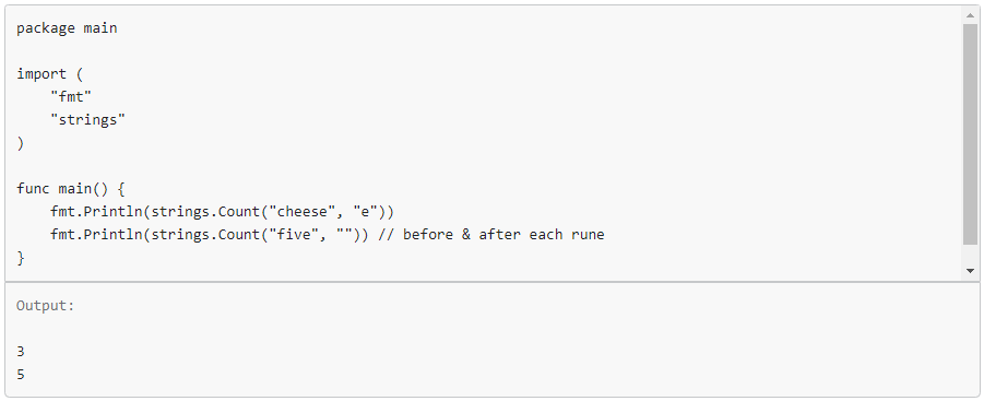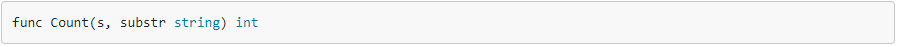 Count подсчитывает количество непересекающихся экземпляров substr в s. Если substr является пустой строкой, Count возвращает 1 + количество кодовых точек Unicode в s.