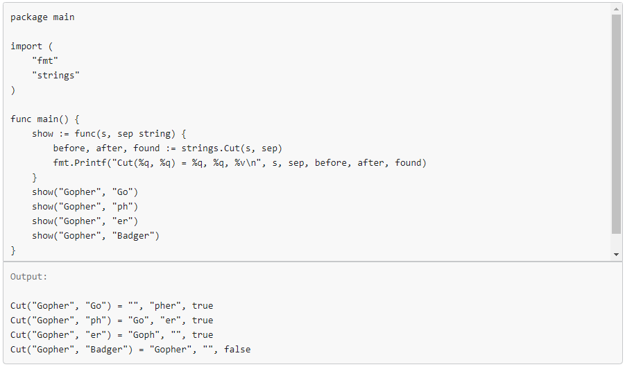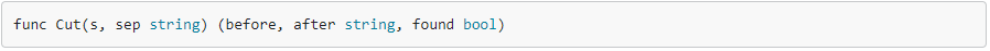 Cut вырезает слайсы s вокруг первого экземпляра sep, возвращая текст до и после sep. Найденный результат сообщает появляется ли sep в s. Если sep не появляется в s, cut возвращает s, "", false.