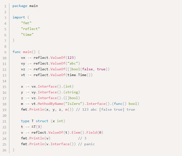 Для значения Go мы можем использовать reflect.ValueOf функцию для создания reflect.Value значения, представляющего значение Go, с помощью interface{}. Обратный процесс аналогичен: мы можем вызвать Interface метод reflect.Value значения, чтобы получить interface{}значение, затем ввести assert для interface{} значения, чтобы получить значение Go, представленное значением (также известным как базовое значение) reflect.Value. Но учти, что вызов Interface метода reflect.Value значения, представляющего неэкспортируемое поле, вызывает панику.