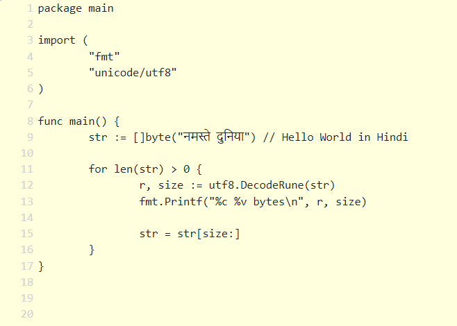 Функция DecodeRuneInString пакета UTF8 похожа на DecodeRune, но ее ввод представляет собой строку.