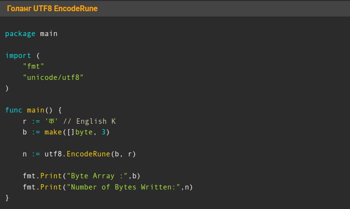 Функция EncodeRune принимает массив байтов и руну и кодирует их в кодировку UTF8.