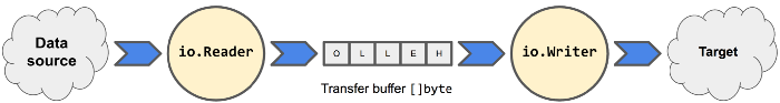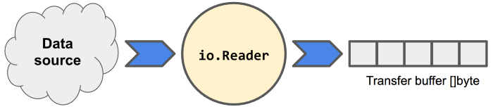 Reader, представленный интерфейсом io.Reader, считывает данные из некоторого источника в буфер передачи, где они могут передаваться и потребляться, как показано ниже