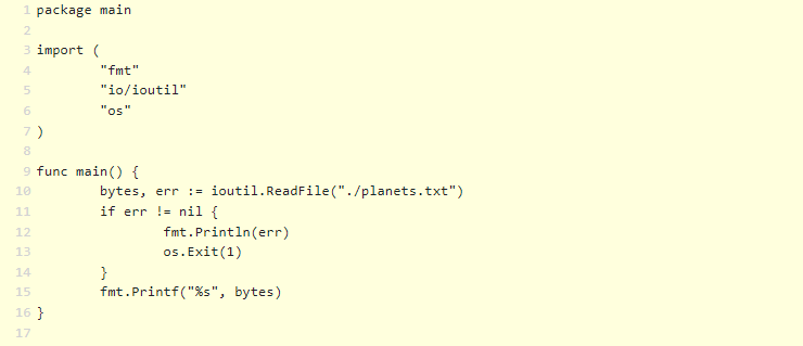 Пакет ioutil, подпакет io, предлагает несколько удобных функций для ввода-вывода. Например, в следующем примере функция используется ReadFile для загрузки содержимого файла в файл []byte.