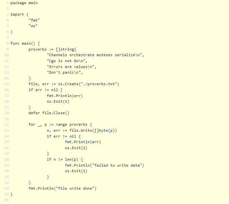 Тип os.File представляет файл в локальной системе. Он реализует и то, и другое io.Reader, io.Writer и, следовательно, может использоваться в любых контекстах потокового ввода-вывода. Например, в следующем примере показано, как записывать последовательные срезы строк непосредственно в файл.