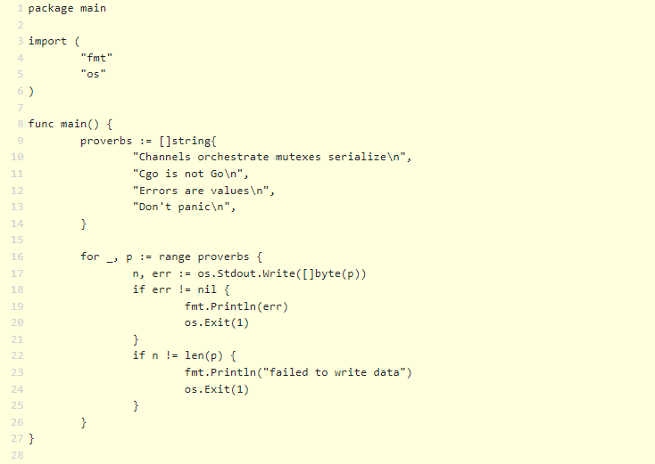 Пакет os предоставляет три переменные: os.Stdout, os.Stdin и os.Stderr, — тип которых *os.File представляет дескрипторы файлов для стандартного вывода, ввода и ошибки ОС соответственно. Например, следующий фрагмент исходного кода печатается прямо в стандартный вывод.