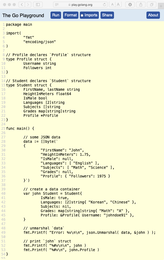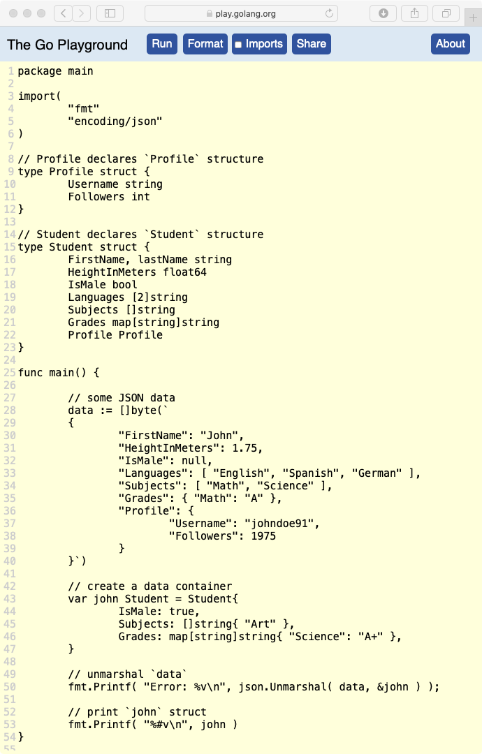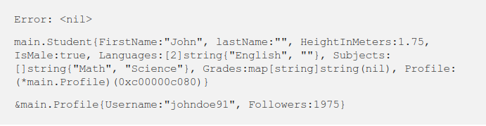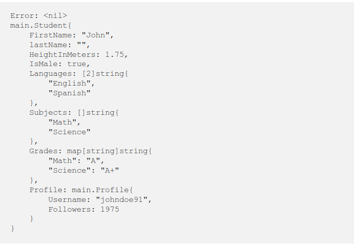 Мы также ввели несколько новых полей в тип Student структуры array и slice структуру map данных. Мы также предоставили данные JSON для этих полей в значении data.