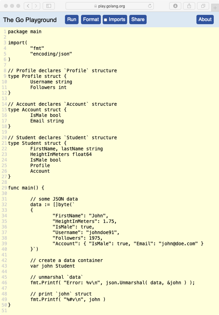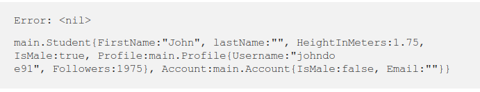 Как видно из приведенного выше примера, обе структуры Account и Profile анонимно вложены внутрь структуры Student. В данные JSON мы добавили поля Followers структуры Profile основного объекта, но данные полей Account предоставляются через объект Account.