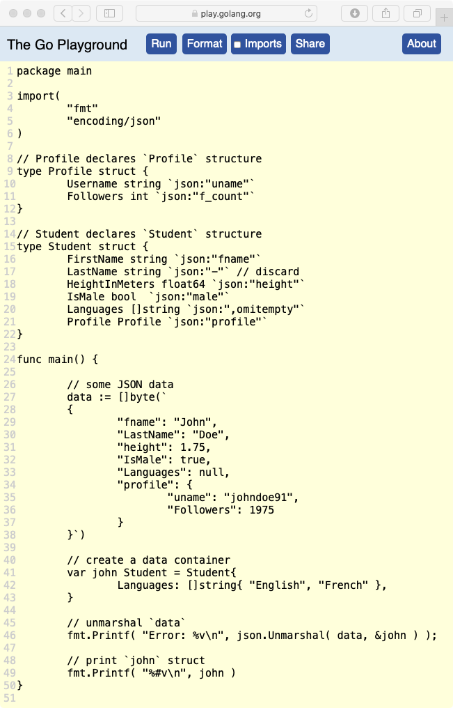 Теги полей структуры могут быть очень полезны для определения имен полей и критериев пропуска. Мы также можем использовать теги структуры для интерполяции имен полей JSON в имена полей struct.