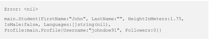 В приведенной выше программе мы пометили все поля структуры соответствующими именами полей JSON. Однако у нас есть поле LastName с тегами json:"-", что означает, что это поле не будет рассматриваться для десортировки .