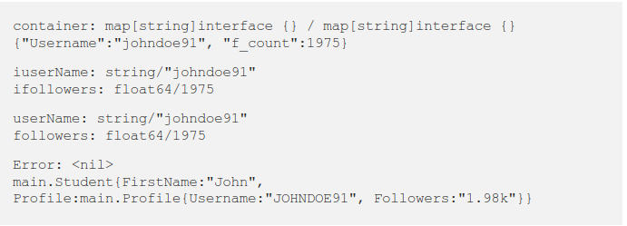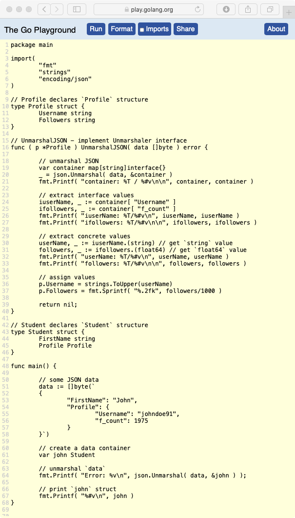 В приведенной выше программе значение поля Profile реализует интерфейс Unmarshaler. Эта программа дает следующий результат.