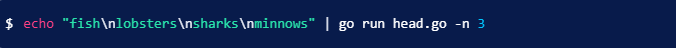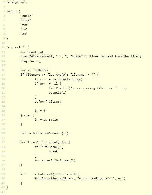 В заключительном разделе используется *bufio.Scanner, созданный с помощью bufio.NewScanner, для считывания строк из переменной io.Reader in. Мы проводим итерацию до значения count в цикле for и вызываем break, если при сканировании строчки buf.Scan получается значение false, показывающее, что количество строчек меньше, чем запрошенное пользователем.