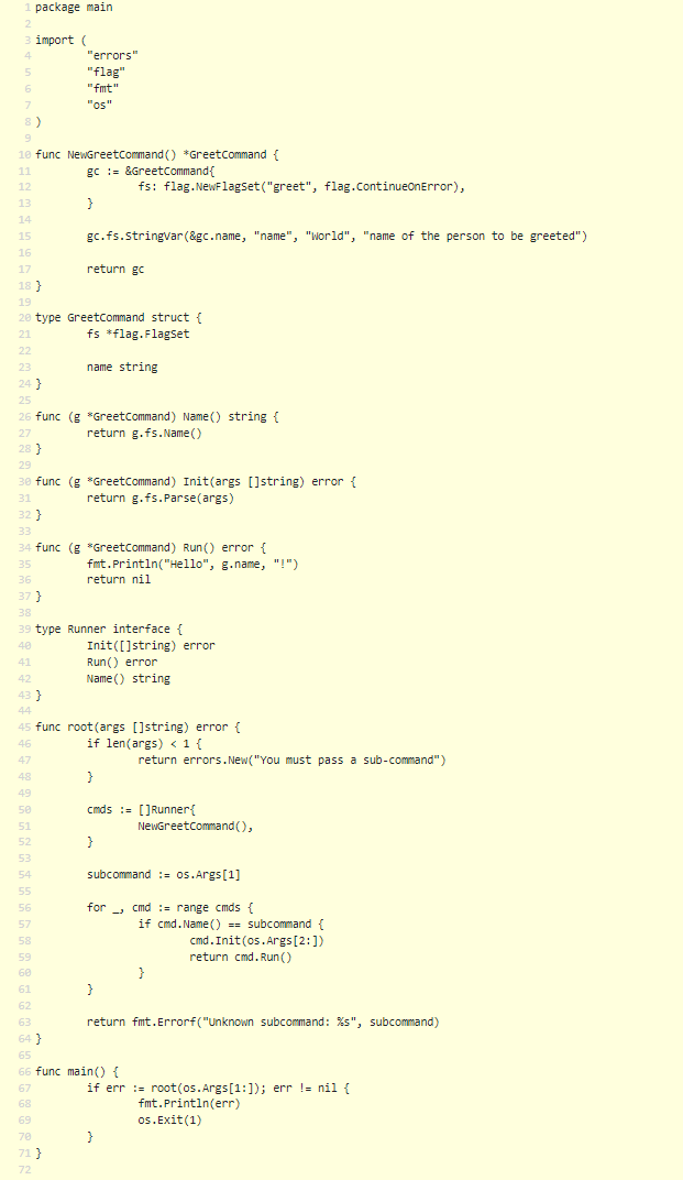 Функция root определяет []Runner, где определяются все субкоманды. Runner — это интерфейс субкоманд, позволяющий функции root получить имя субкоманды с помощью Name() и сравнить его с содержанием переменной subcommand. После обнаружения правильной субкоманды посредством итерации переменной cmds мы инициализируем субкоманду с остальными аргументами и вызываем метод Run() для этой команды.
