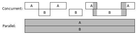 Конкурентные вычисления — это форма вычислений, при которой несколько вычислений выполняются в течение перекрывающихся периодов времени. На следующем изображении показаны два случая конкурентных вычислений. На изображении A и B представляют собой два отдельных вычисления. Второй случай также называется конкурентными вычислениями, то есть специальными одновременными вычислениями. В первом случае А и В параллельны только в течение небольшого промежутка времени.