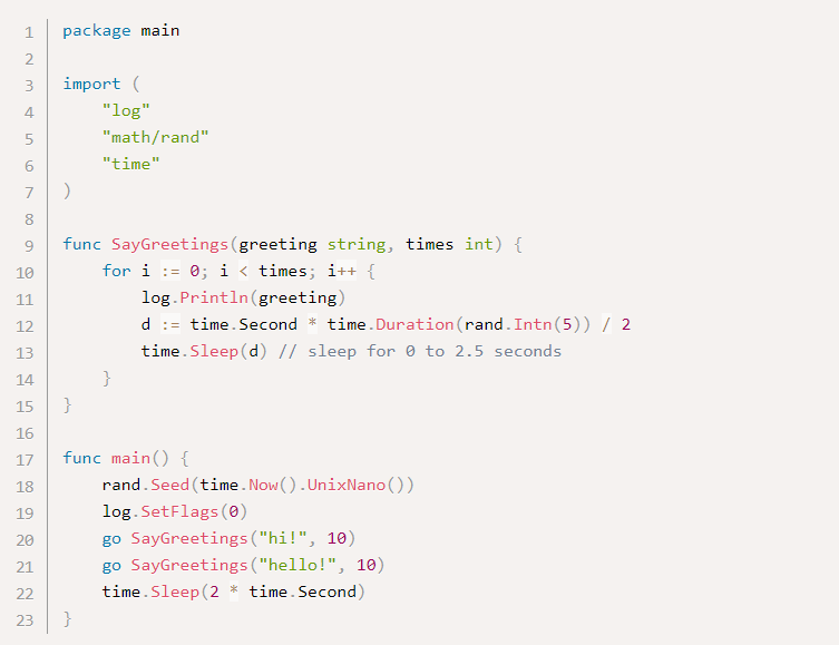 Все значения результата вызова функции горутины (если вызываемая функция возвращает значения) должны быть отброшены в операторе вызова функции. Ниже приведен пример создания двух новых горутин в основной горутине. В примере time.Duration это пользовательский тип, определенный в time стандартном пакете. Его базовым типом является встроенный тип int64.