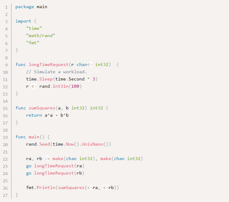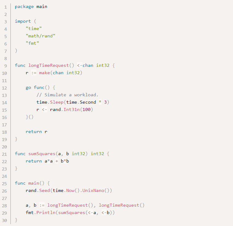 В примере ниже sumSquares одновременно запрашиваются значения двух аргументов вызова функции. Каждая из двух операций приема канала будет заблокирована до тех пор, пока операция отправки не будет выполнена на соответствующем канале. Для возврата окончательного результата требуется около трех секунд вместо шести.