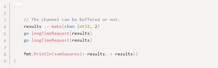 Как и в предыдущем примере, в следующем примере значения двух аргументов вызова функции sumSquares запрашиваются одновременно. В отличие от последнего примера, функция longTimeRequest принимает в качестве параметра канал только для отправки, а не возвращает результат канала только для приема.