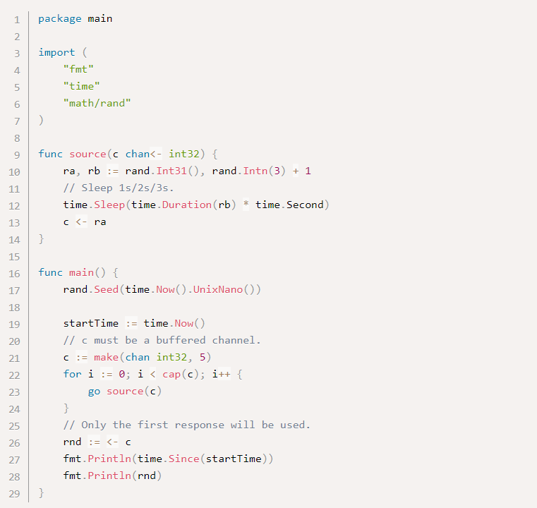 Иногда часть данных может быть получена из нескольких источников, чтобы избежать больших задержек. Для многих факторов продолжительность отклика этих источников может сильно различаться. Даже для указанного источника длительность его отклика также непостоянна. Чтобы сделать продолжительность ответа как можно короче, мы можем отправить запрос каждому источнику в отдельной горутине. Будет использован только первый ответ, остальные более медленные будут отброшены.